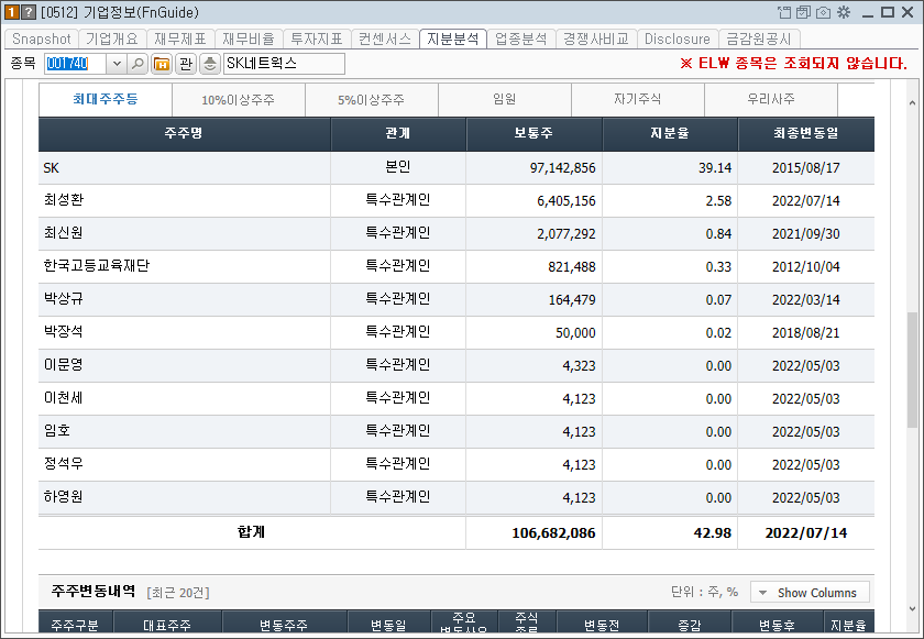 - 1953년에 직물회사로 설립된 동사는 국내외 네트워크와 물류능력을 기반으로 석유제품 중심의 에너지 유통, 휴대폰 중심의 정보통신 유통, 글로벌 무역업을 영위함. 렌터카, 자동차 경정비 등의 Car Biz.사업, 주방가전 및 환경가전 렌탈 사업 등의 성장사업과 워커힐호텔을 운영함. 정보통신사업은 자회사인 SK네트웍스서비스를 통하여 SK텔레콤 및 SK브로드밴드의 네트워크망 운용, 통신시스템 장비 유통 등 다양한 서비스를 제공함.